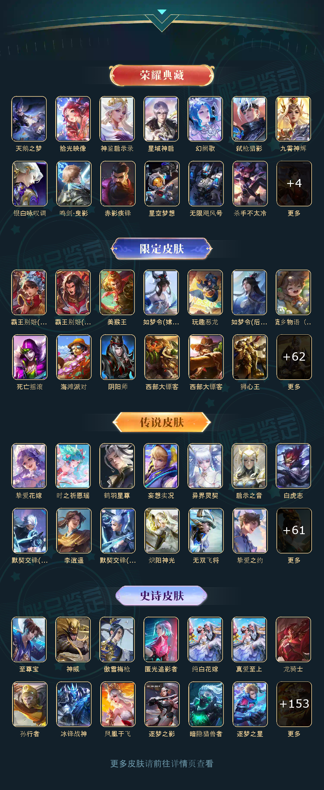 贵族等级V10,英雄数量124,典藏皮肤数16,皮肤数量503,神鉴启示录/弑枪猎影/幻阙歌/银白咏叹调/赤影疾锋/九霄神辉