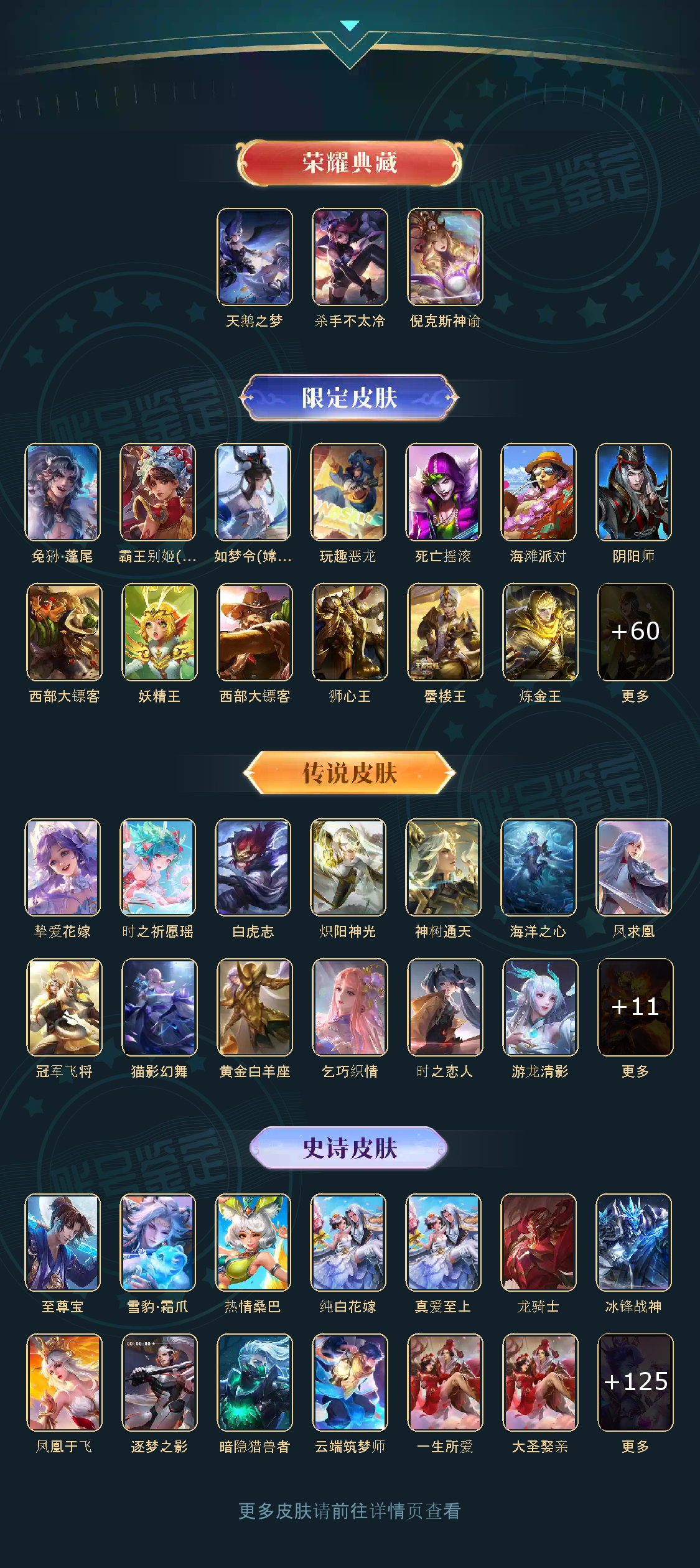 贵族等级V10,英雄数量125,典藏皮肤数3,皮肤数量401,