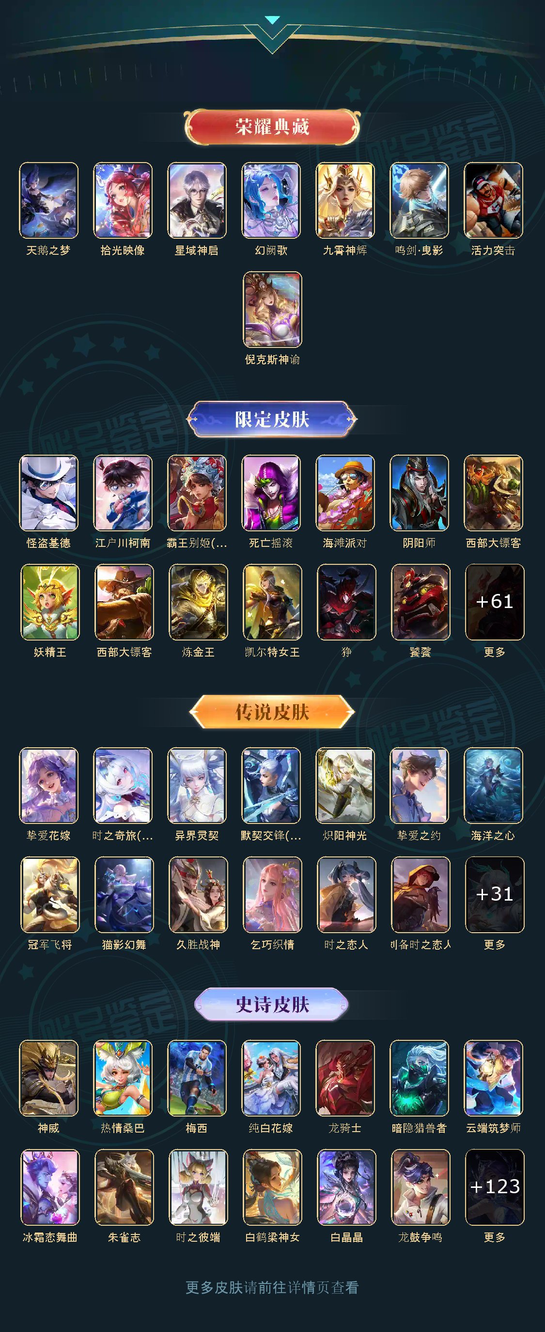 贵族等级V10,英雄数量125,典藏皮肤数7,皮肤数量430,