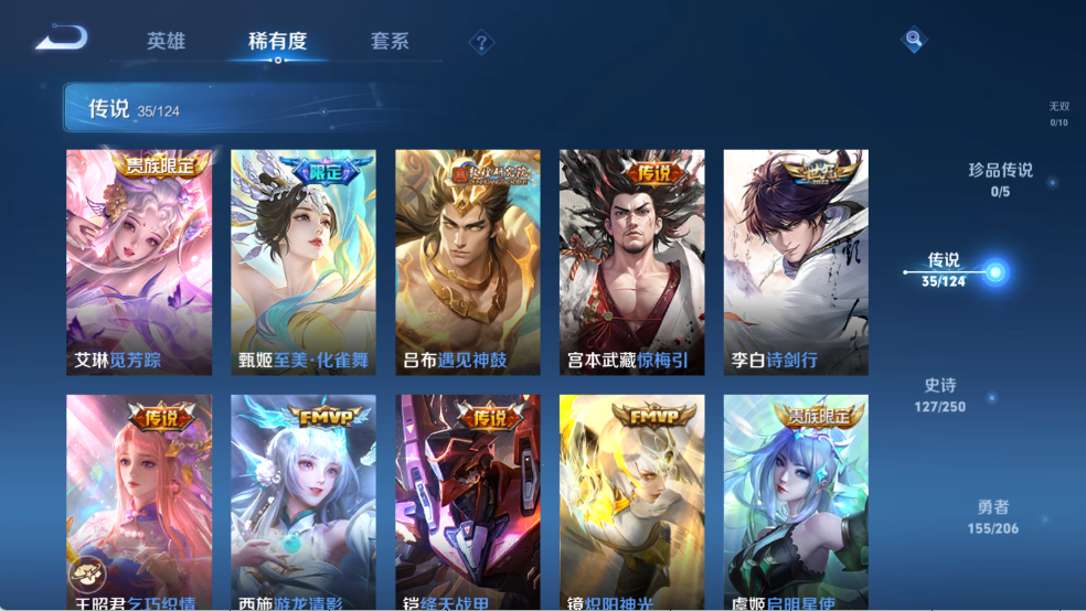 贵族等级V10,英雄数量124,典藏皮肤数5,皮肤数量409,