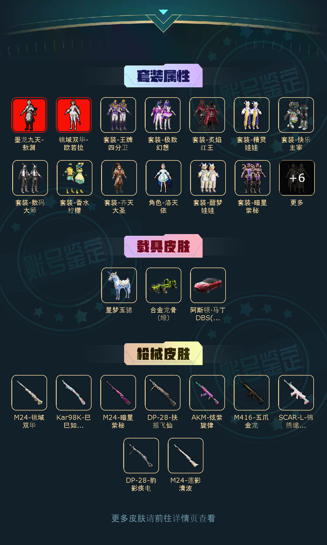 【稀有资产】墨龙九天-敖渊[2级]/镜域双华-欧若拉[3级]/角色-真理款战斗服/套装-奇异狩猎者/套装-萌熊伴侣/套装-浪漫天命/套装-潮萌小黄鸭/套装-雪山精英/套装-龟仙人/套装-迅捷狂鲨/套装-浪漫波比/角色-粉雾星云/套装-暗夜武装/套装-东方飞龙/M416-仓鼠灰灰