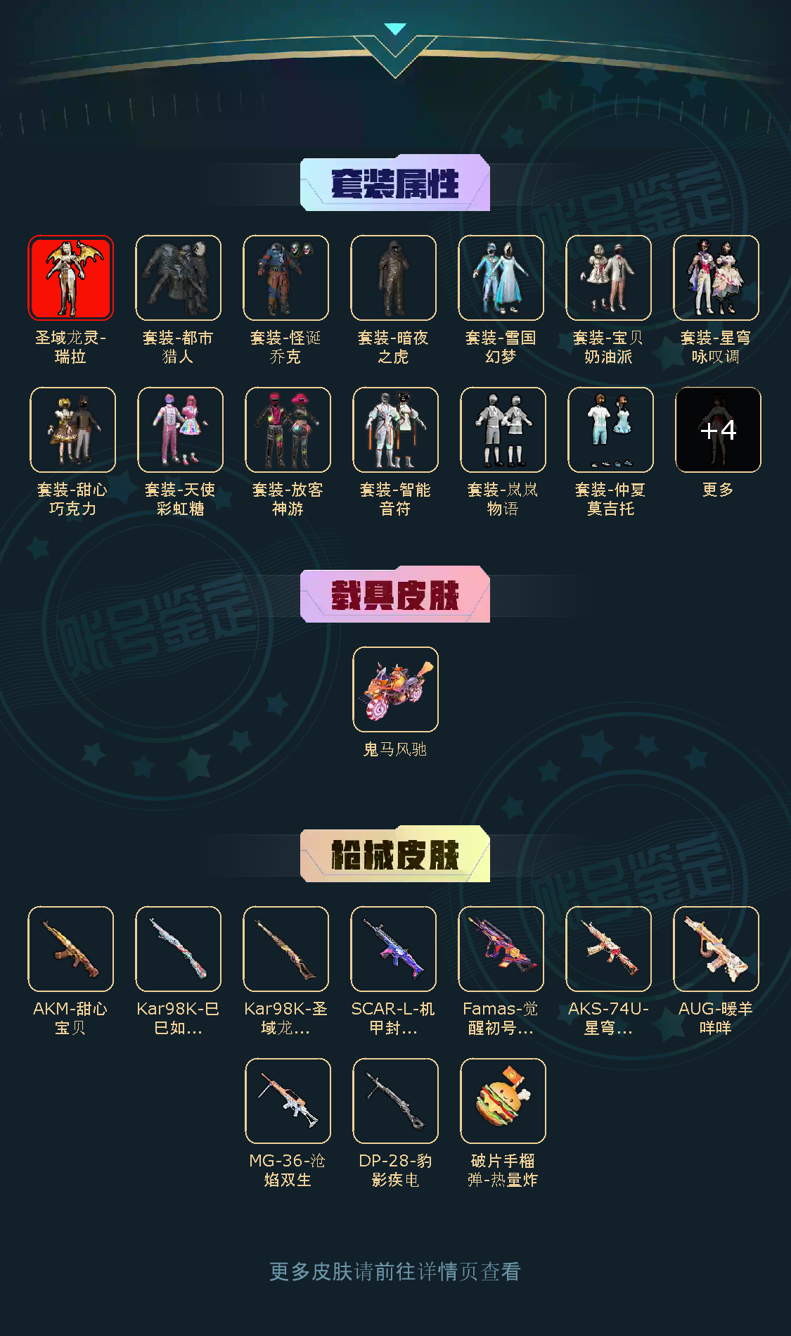 【稀有资产】圣域龙灵-瑞拉[2级]/套装-雪国幻梦/套装-怪诞乔克/破片手榴弹-热量炸弹/AKM-甜心宝贝/AUG-暖羊咩咩/角色-Mark.06/小丑红鼻头/套装-深海小丑鱼/套装-都市猎人/套装-奇异狩猎者/套装-胖达圆圆/套装-粉红小猪/套装-浪漫天命/套装-雪山精英/套装-暗影哥特/套装-龟仙人/套装-迅捷狂鲨/套装-浪漫波比/套装-暗夜之虎/套装-墨青刃影/套装-恶魔人蛛/套装-狂沙舞者/套装-萌萌史莱姆/套装-东方飞龙/套装-冷酷挑战者/玩偶服-美羊羊/角色-六号稻草人/角色-乐音/M416-星际漫游/M416-仓鼠灰灰