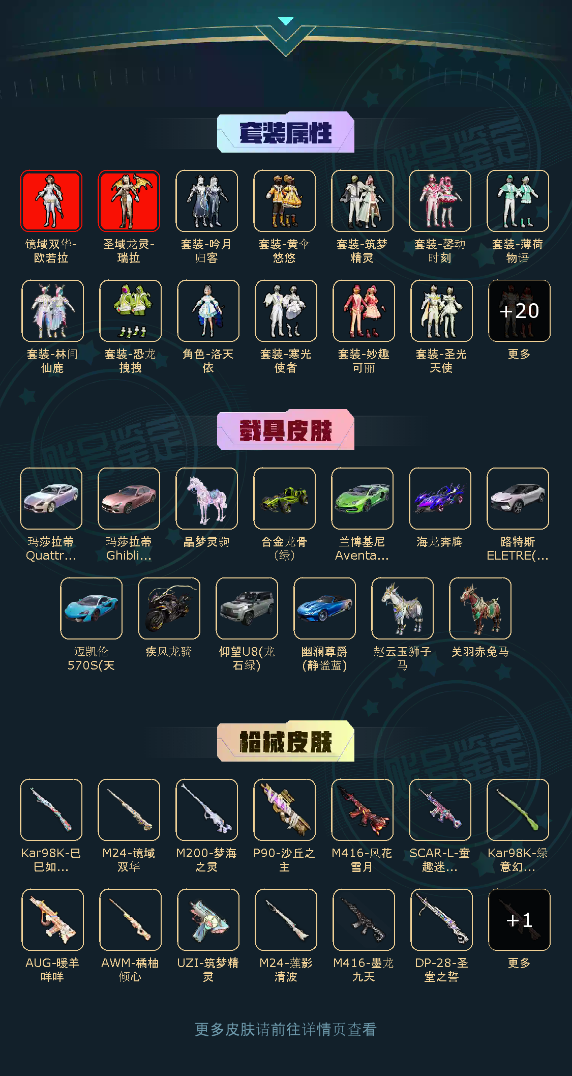 【粉色枪皮】SCAR-L-童趣迷兔/Kar98K-绿意幻情/M24-莲影清波/Kar98K-巳巳如意/AWM-橘柚倾心/UZI-筑梦精灵/M24-镜域双华/M200-梦海之灵/P90-沙丘之主/DP-28-圣堂之誓